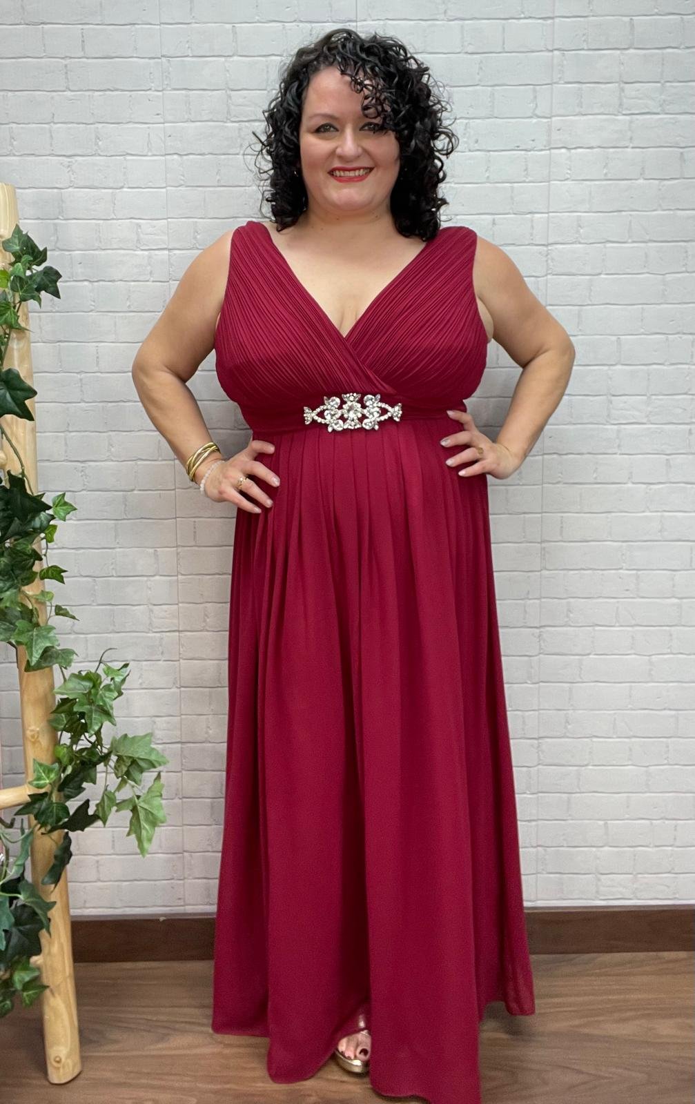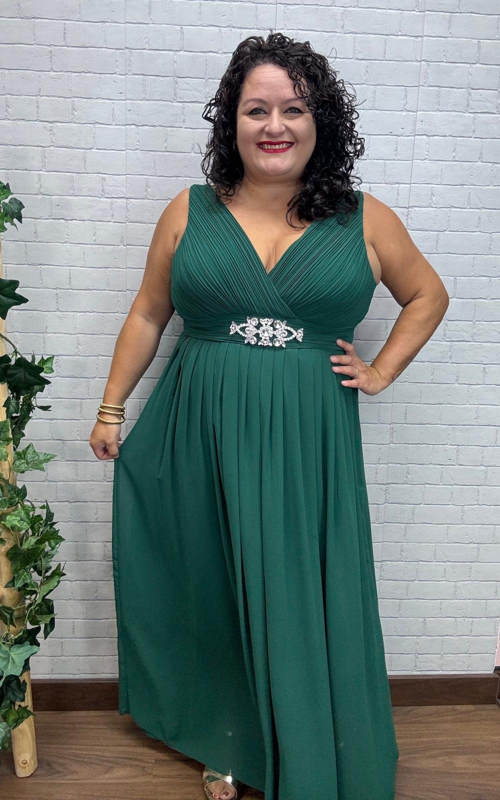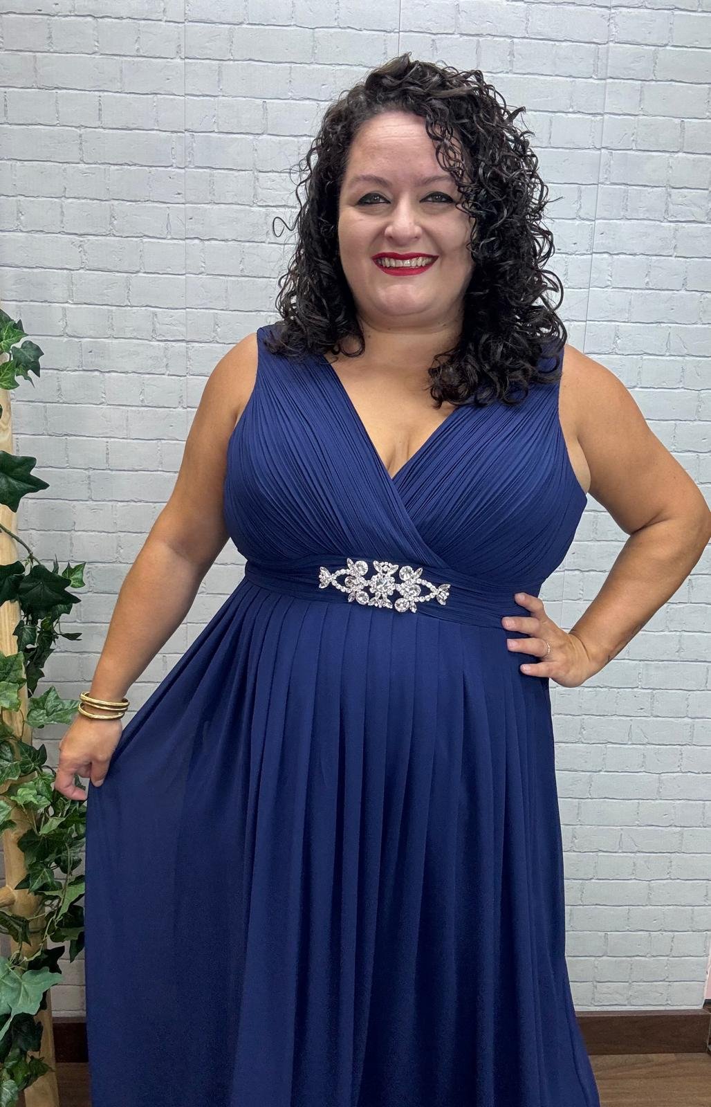 El corte imperio bajo el pecho ayuda a definir la figura sin marcar el abdomen, mientras que la falda plisada de caída fluida aporta movimiento, ligereza y un efecto visual que alarga la silueta. El detalle joya en la cintura añade un toque sofisticado y femenino, convirtiéndolo en un vestido ideal para ocasiones especiales.