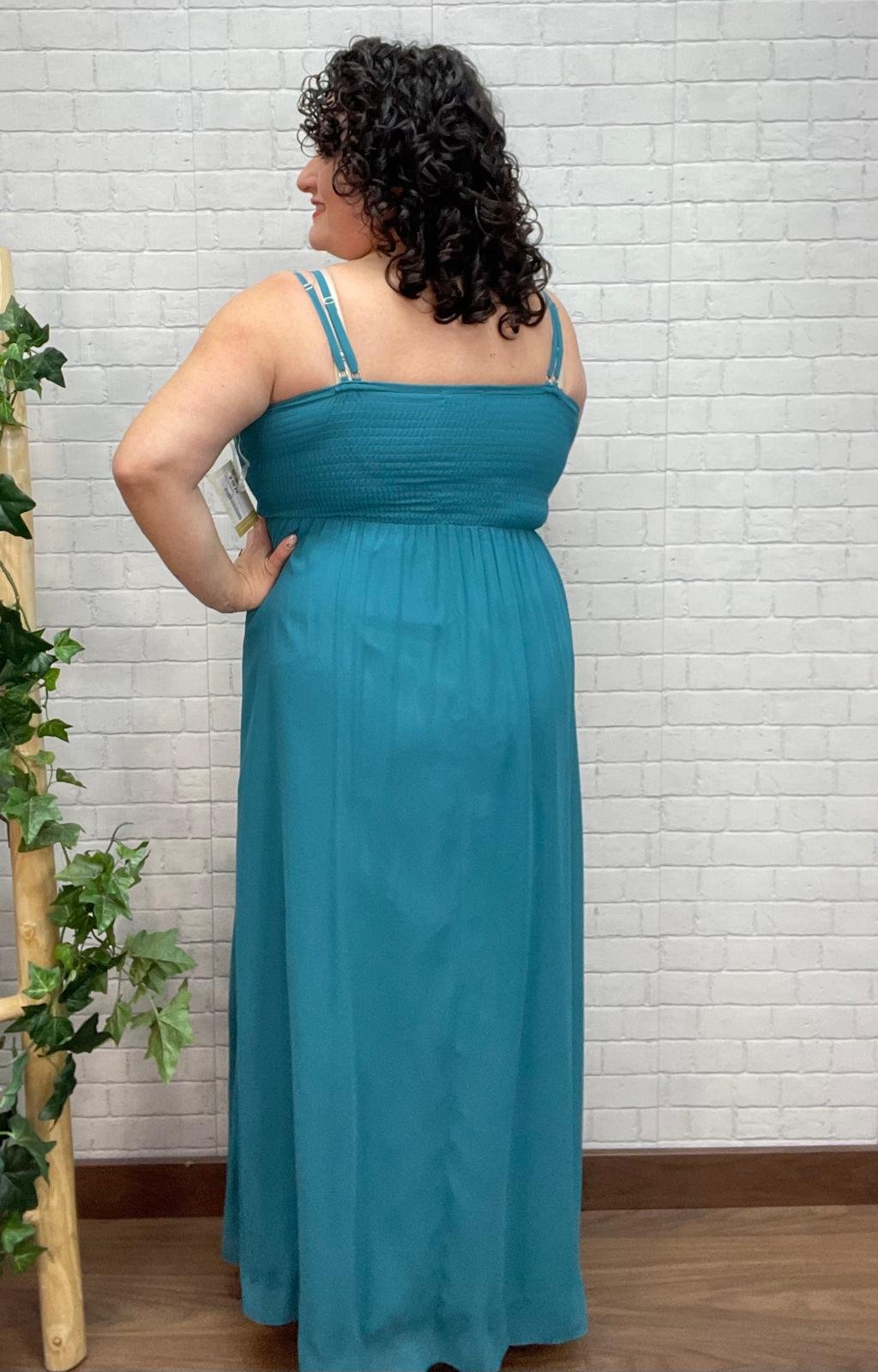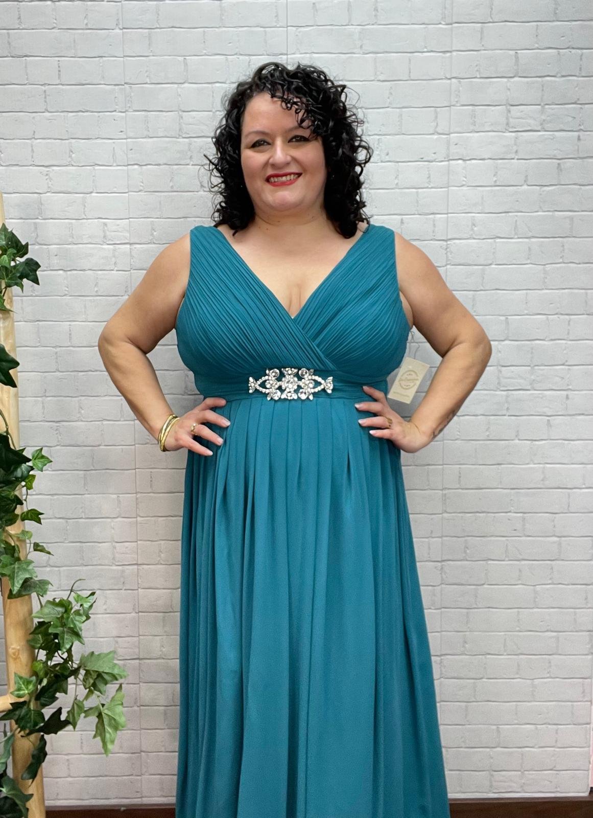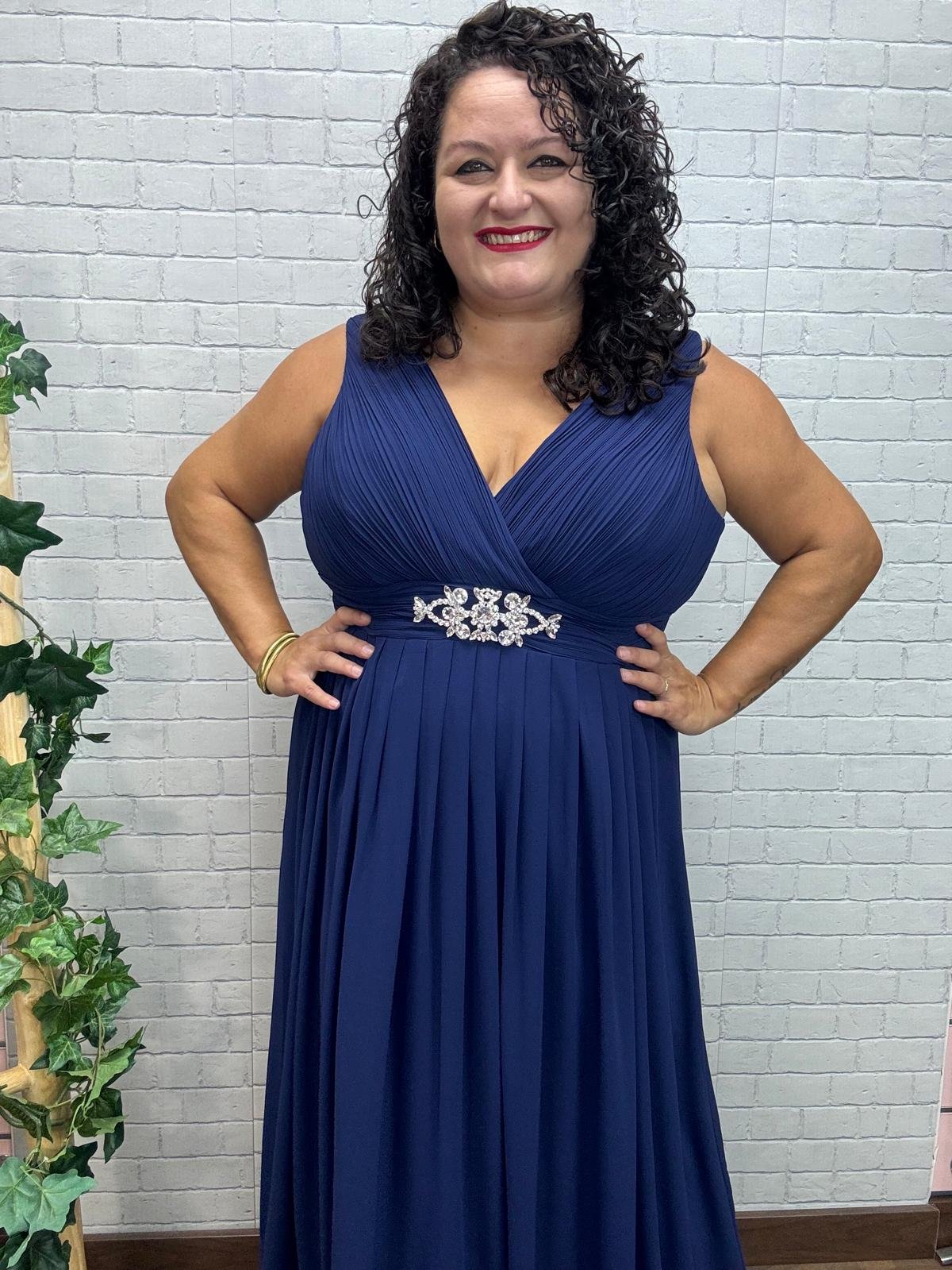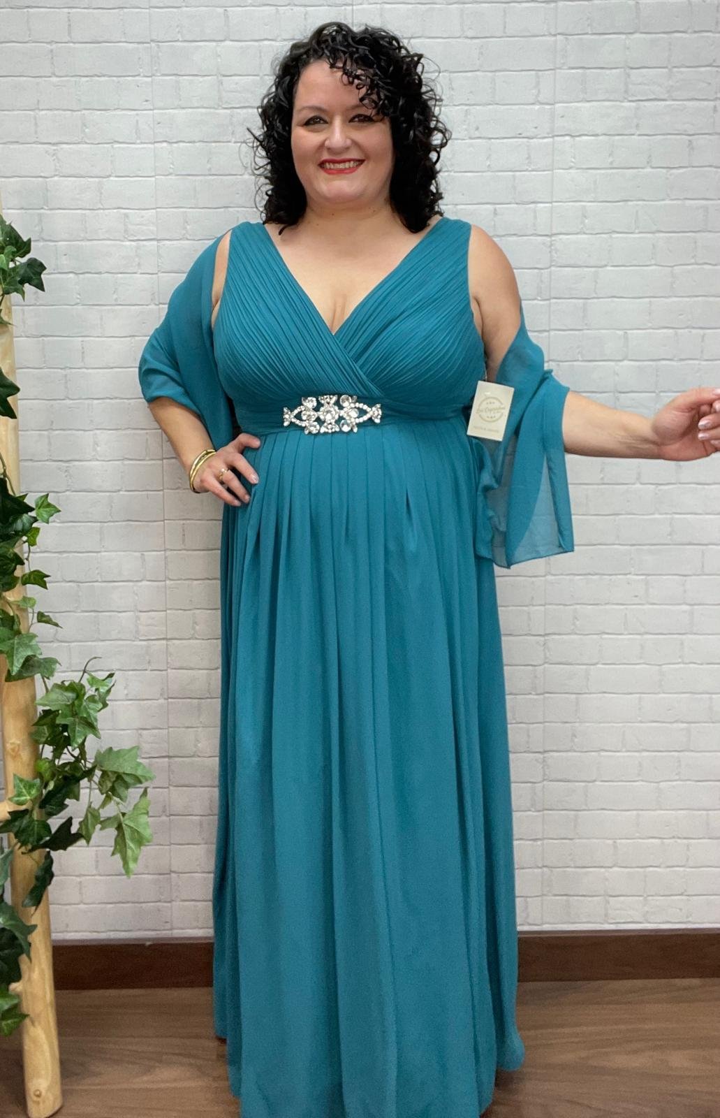 El corte imperio bajo el pecho ayuda a definir la figura sin marcar el abdomen, mientras que la falda plisada de caída fluida aporta movimiento, ligereza y un efecto visual que alarga la silueta. El detalle joya en la cintura añade un toque sofisticado y femenino, convirtiéndolo en un vestido ideal para ocasiones especiales.