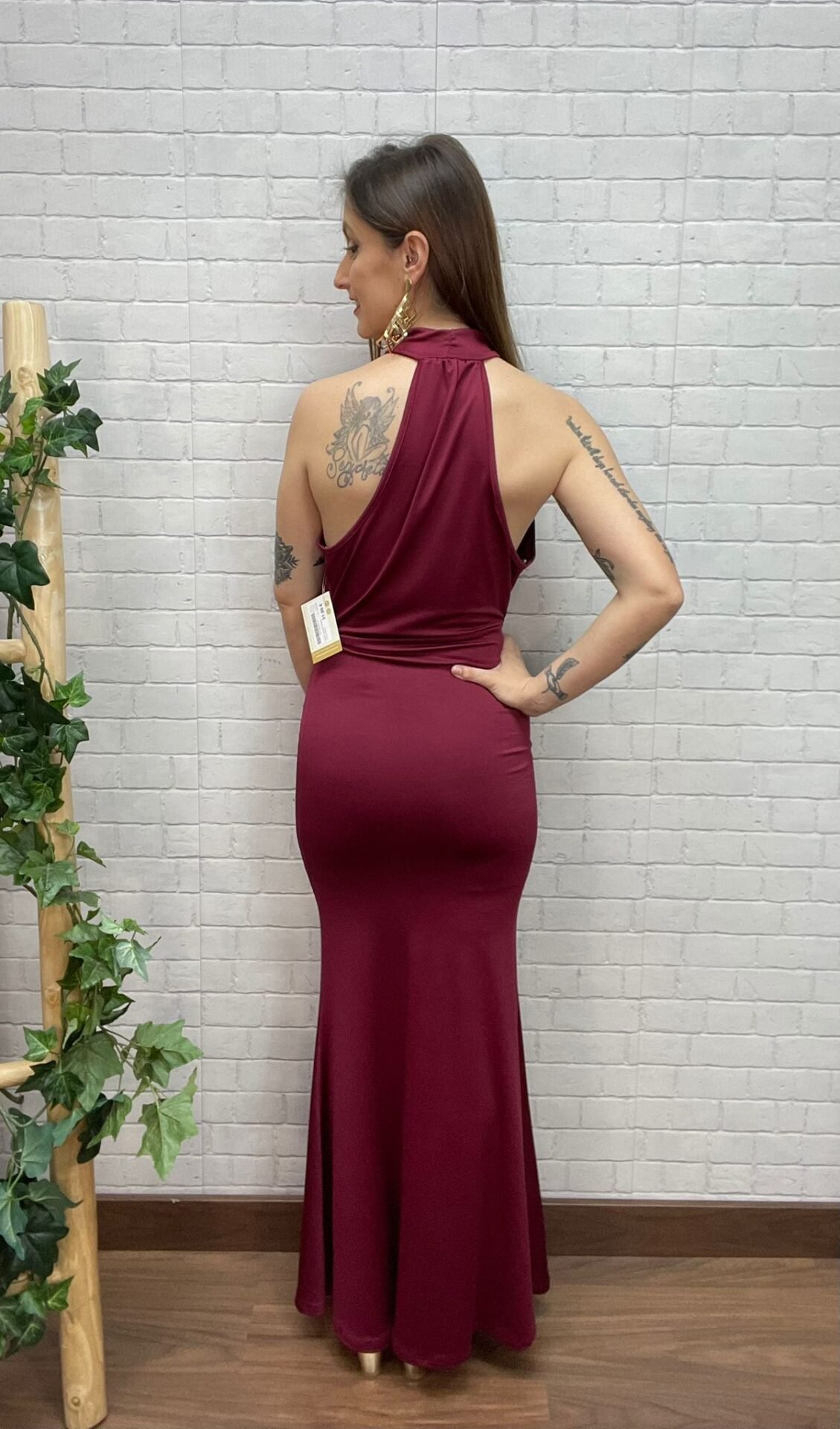 •Un vestido burdeos sofisticado con escote halter y drapeado que estiliza la figura con elegancia y sensualidad.