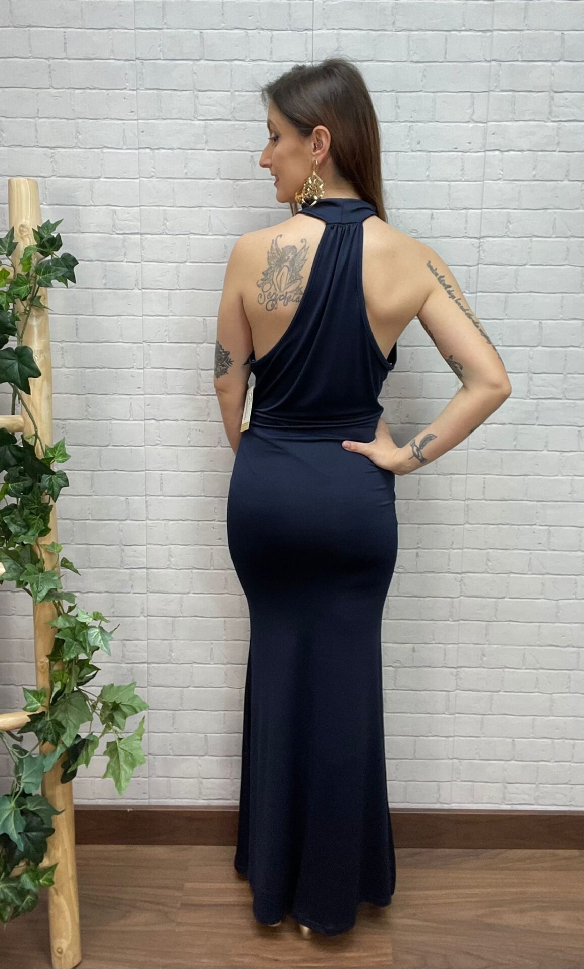 •Un vestido marino sofisticado con escote halter y drapeado que estiliza la figura con elegancia y sensualidad.